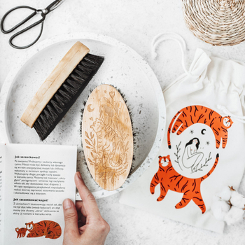 Ręcznie wykonana, drewniana szczotka (z końskim włosiem) do masażu ciała na sucho, zdobiona grafiką autorstwa Moniki Smetaniuk.