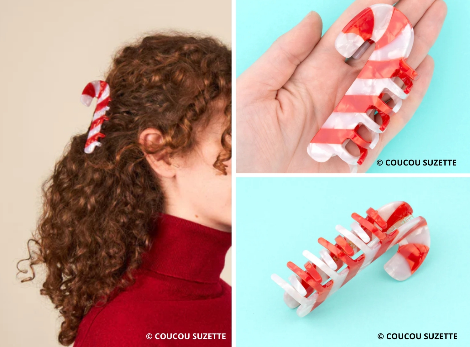 • Świąteczna klamra do włosów w kształcie cukrowej laski.