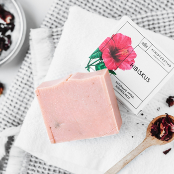 Przyjemnie różowe, naturalne, wegańskie mydło do ciała z ekstraktem z kwiatów hibiskusa, różową glinką francuską, nierafinowanym masłem shea i kakaowym, olejami roślinnymi i świeżym, cytrusowo-kwiatowym aromatem.