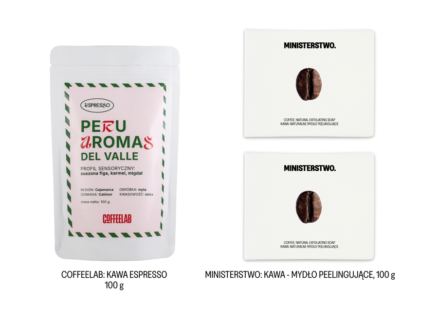 Zestaw dla wielbicieli małej czarnej, espresso doppio, caffé latte. Ziarnista kawa od Coffeelab oraz dwa peelingujące mydła z mieloną kawą od Ministerstwa.