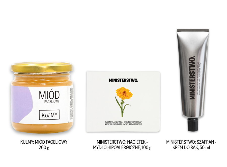 Szafran - bestsellerowy krem do rąk, który zadba o dłonie najdroższych osób, delikatne mydło nagietkowe oraz słoik złocistego miodu od KULMY, by osłodzić zimowe spotkania przy herbatce ♥