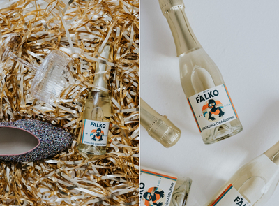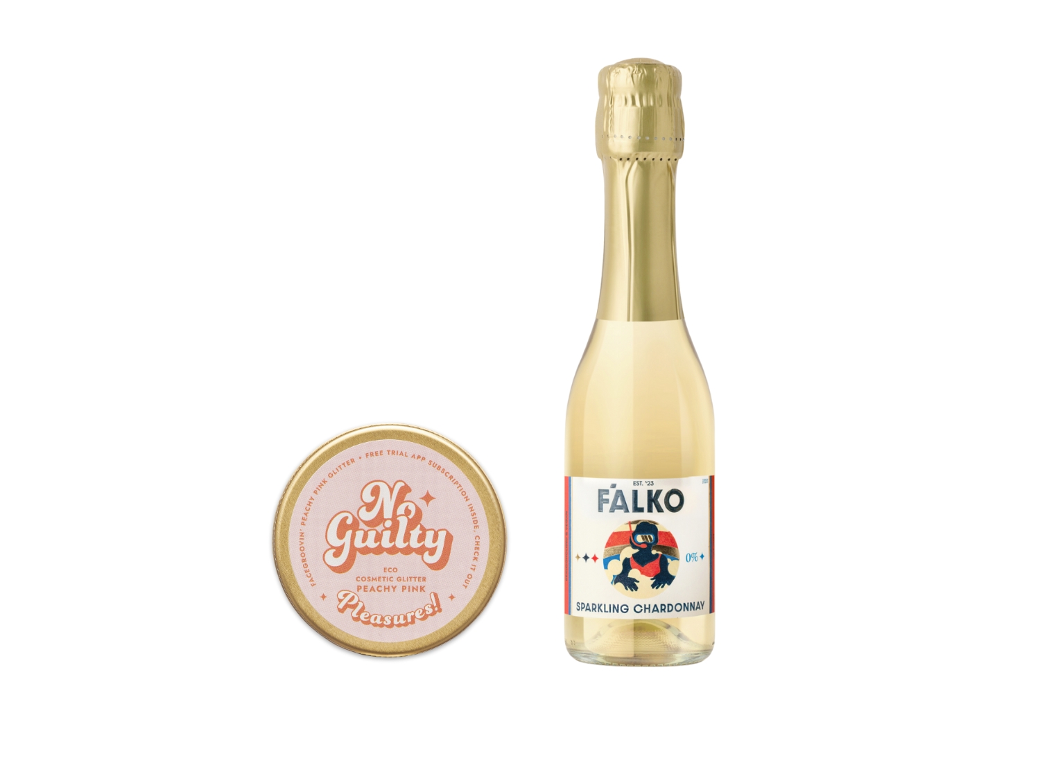 Sylwestrowy zestaw F'ALKO & Ministerstwo., w którym znajdziesz półwytrawne, bezalkoholowe wino musujące Sparkling Chardonnay 0% w wersji mini (200 ml) oraz dużo brokatowego blasku w ekologicznym wydaniu (nasz brokat jest biodegradowalny!) w brzoskwiniowo-różowym kolorze Peachy Pink.