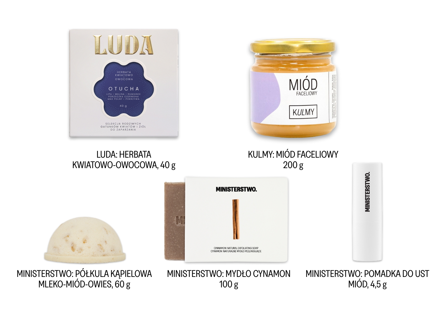 Miodowo-herbaciany zestaw prezentowy, gotowy do wręczenia bliskim i dalszym, z ciepłym, przyjacielskim uściskiem.