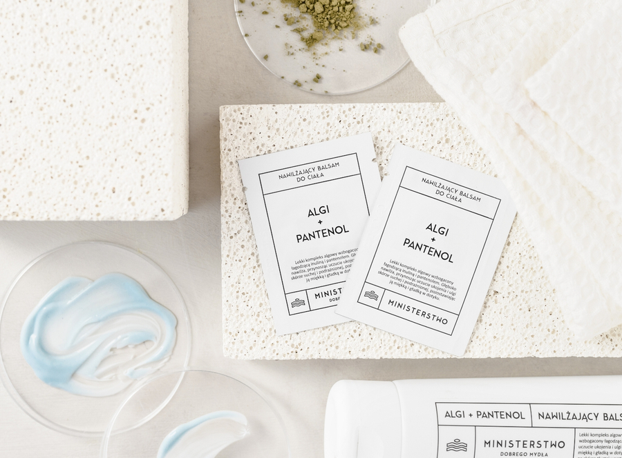 Próbka nawilżającego balsamu do ciała Algi + Pantenol.